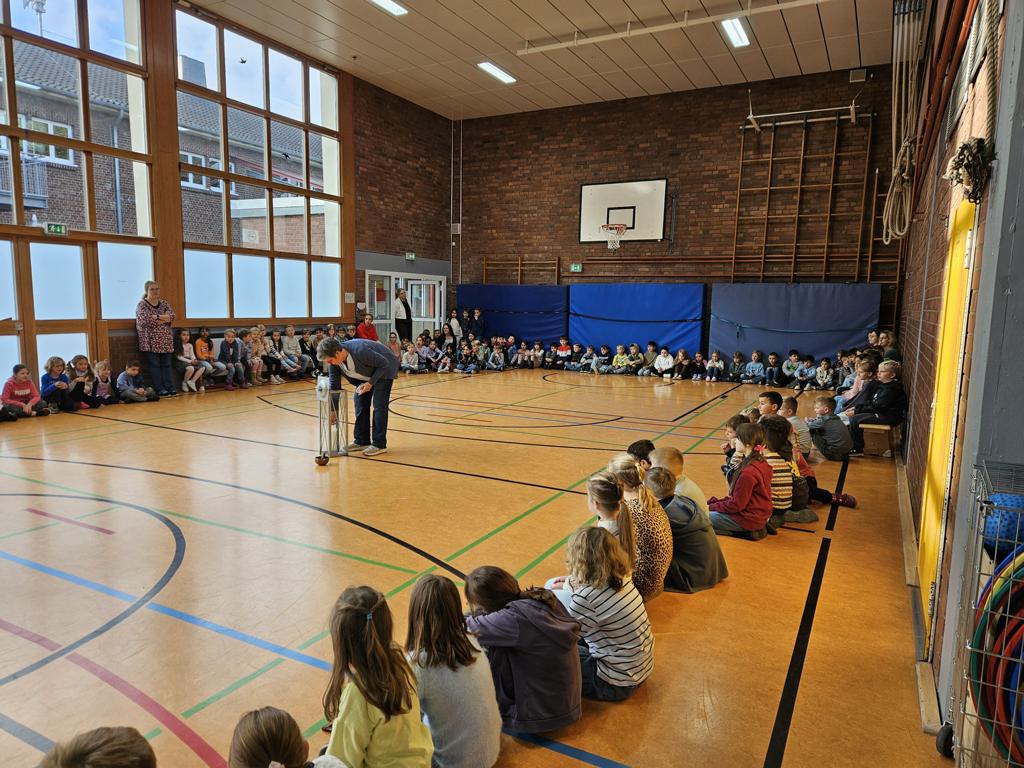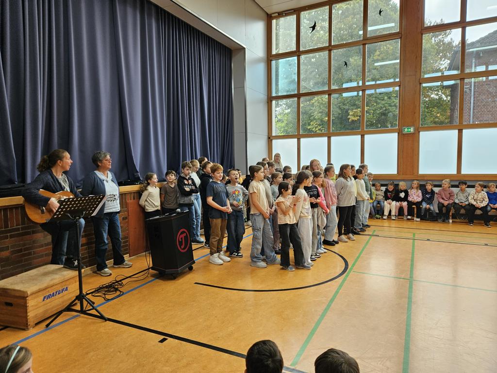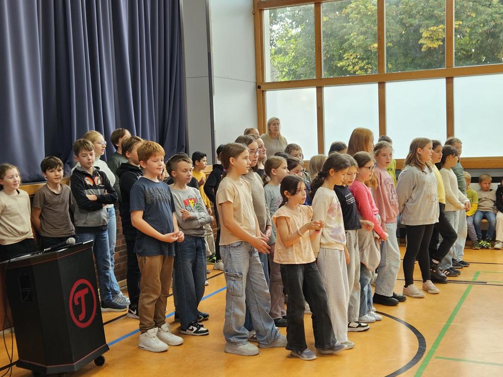Als musikalische Grundschule integrieren wir viel Musik in unseren Tag. Heute fand wieder unser Herbstsingen statt, bei dem wir uns mit der ganzen Schule in der Turnhalle getroffen und gemeinsam gesungen haben. Zunächst entzündete Frau Grabowski-Kämper jedoch ein Licht und wir hielten einen Moment inne, in dem jeder an jemanden denken oder einen guten Wunsch gedanklich senden konnte.