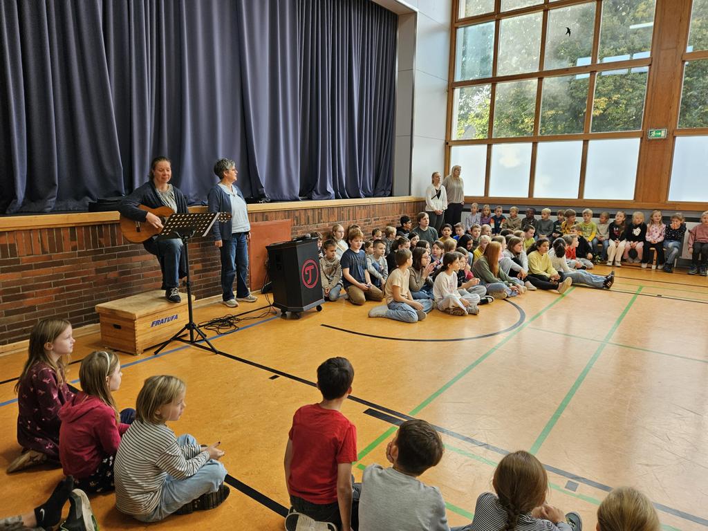 Anschließend wurde gesungen. Das Lied "Der Herbst ist da" können auch die Erstklässler, die noch gar nicht so lange in der Schule sind, richtig gut mitsingen und so schallte es durch die ganze Turnhalle. "Hejo spann den Wagen an" sangen wir erst gemeinsam, dann im Kanon. Bei dem Lied "Herr Bst" unterstützten die Viertklässler uns tatkräftig, da sie besonders bei dem Lied wirkliche Textprofis sind!