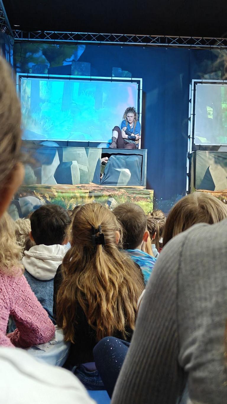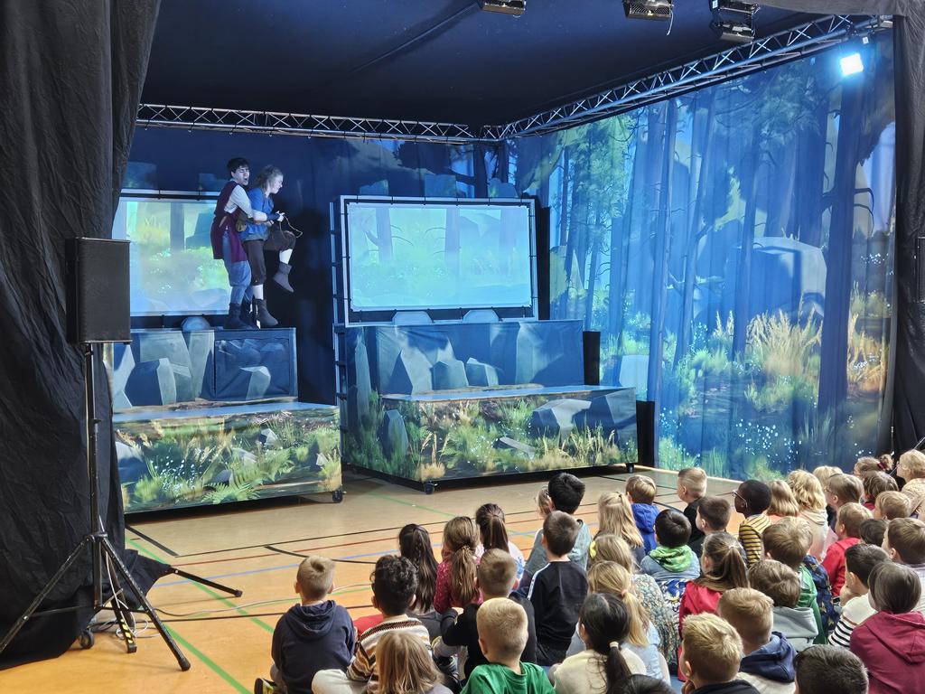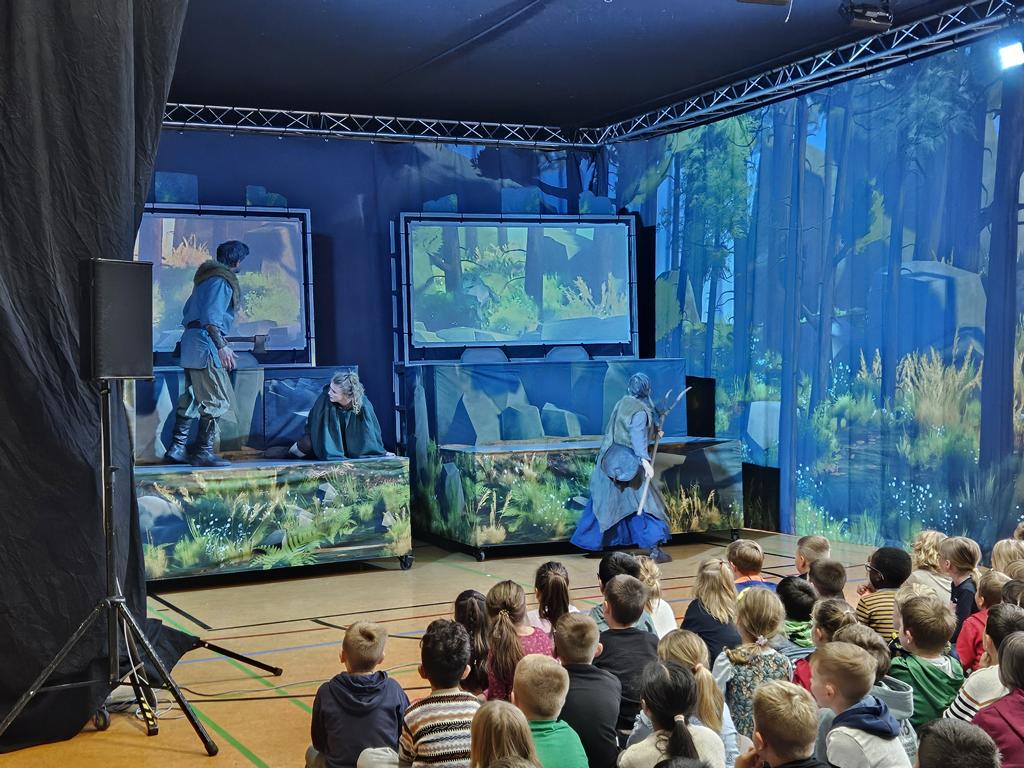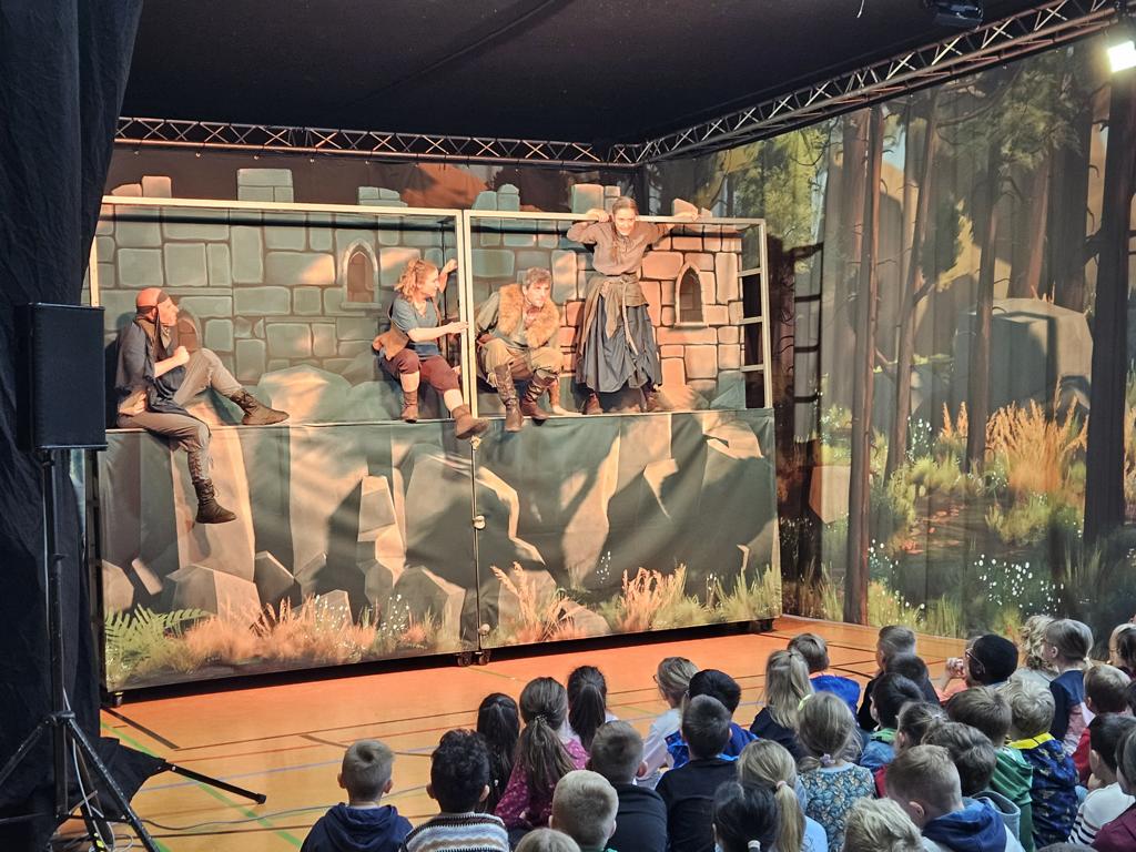 Heute war das DASDA-Theater Aachen bei uns zu Gast und hat das Stück "Ronja Räubertochter" vorgespielt. Es geht um ein neugieriges Mädchen, das mit seiner Familie im Wald auf der Mattisburg lebt. Ronja ist sehr abenteuerlustig und liebt die Wildnis. Sie lernt Birk kennen und freundet sich mit ihm an, doch ihre Familien sind verfeindet. Als die Kinder den Streit der Familien nicht mehr ertragen können, fliehen sie in den Wald und erleben dort ihr eigenes Abenteuer. Mehr verraten wir natürlich nicht, denn uns hat das Stück wirklich gut gefallen und vielleicht will es sich noch jemand im Theater anschauen.
