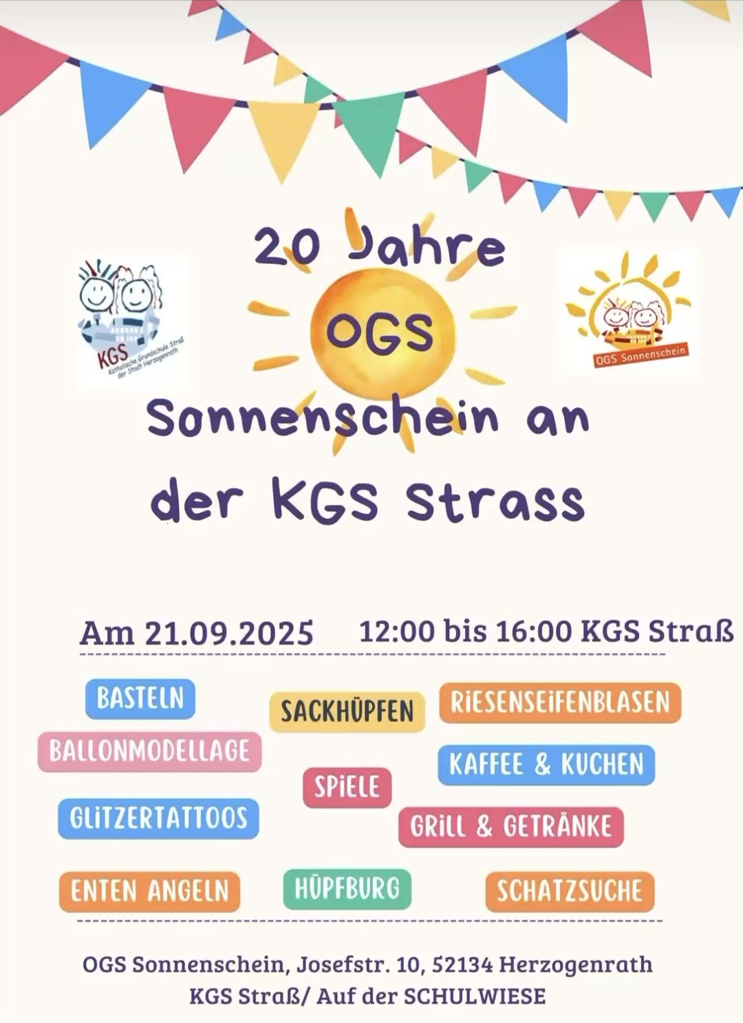 OGS Am Sonntag feiert unsere OGS 20jähriges Jubiläum. Ein buntes Programm erwartet uns, also seid unbedingt dabei.