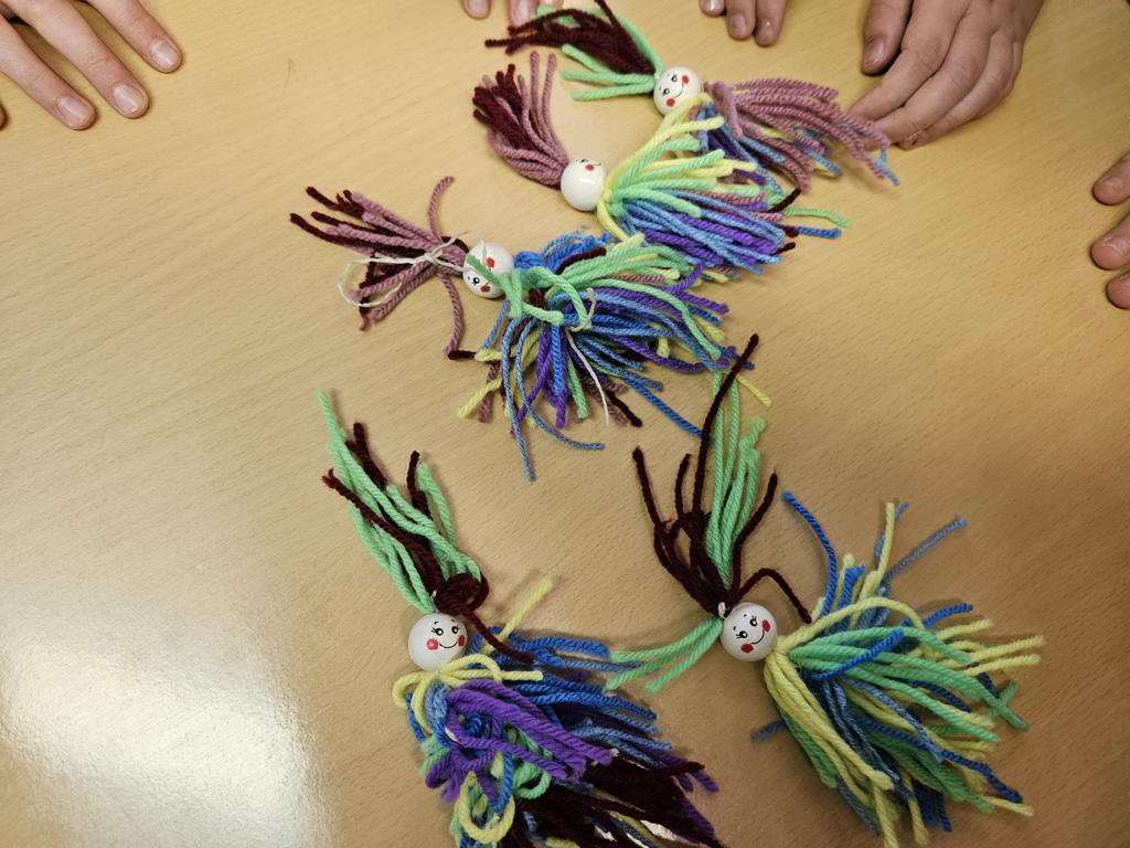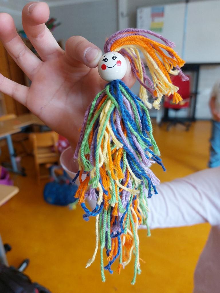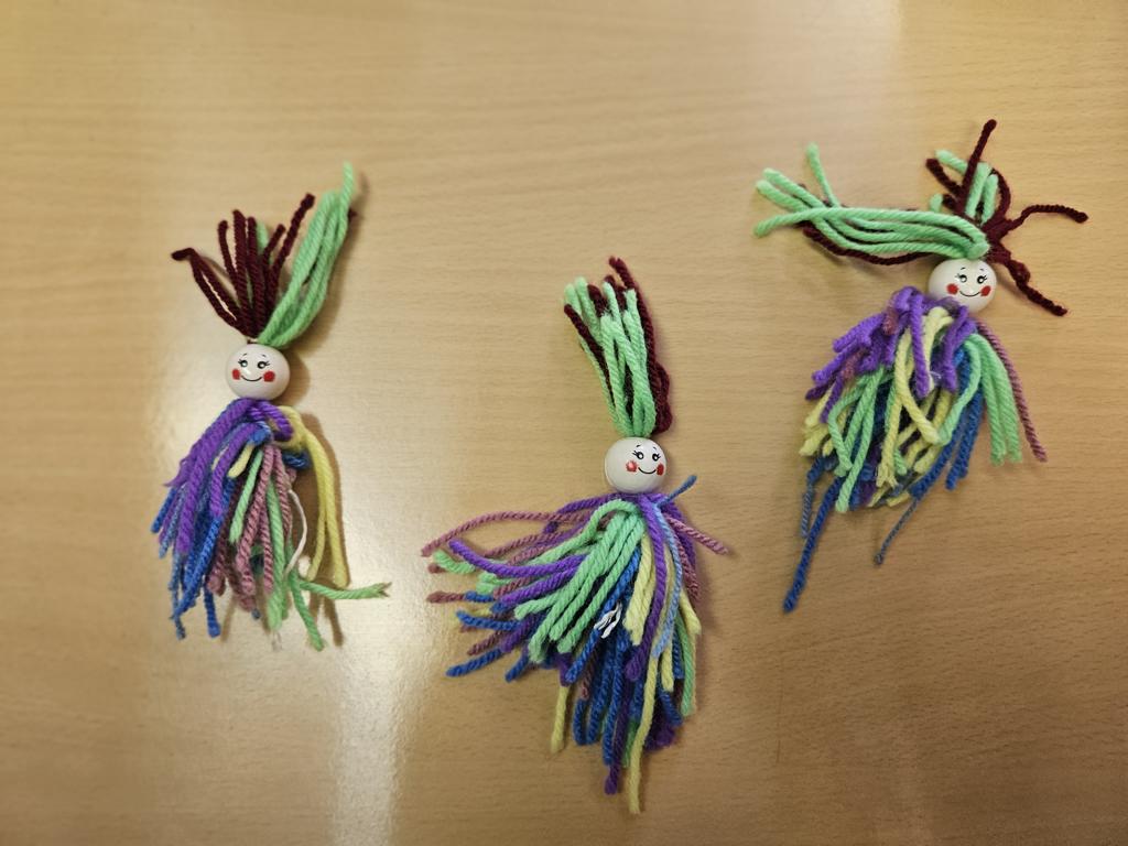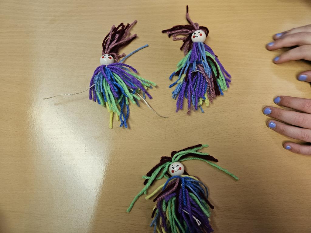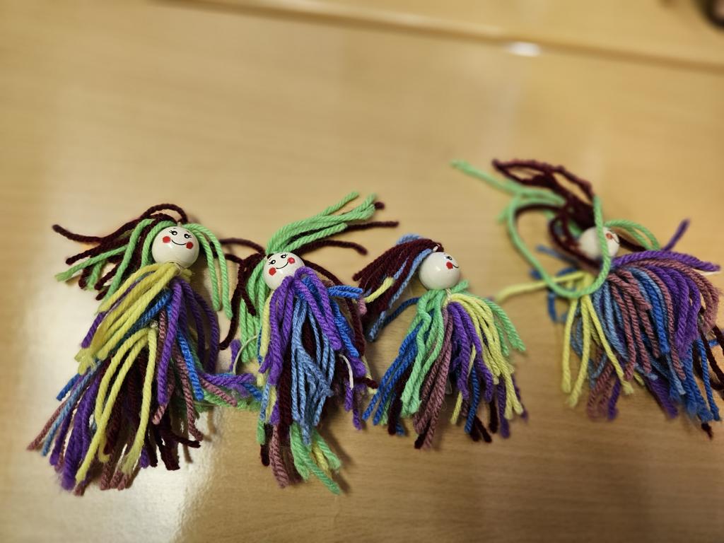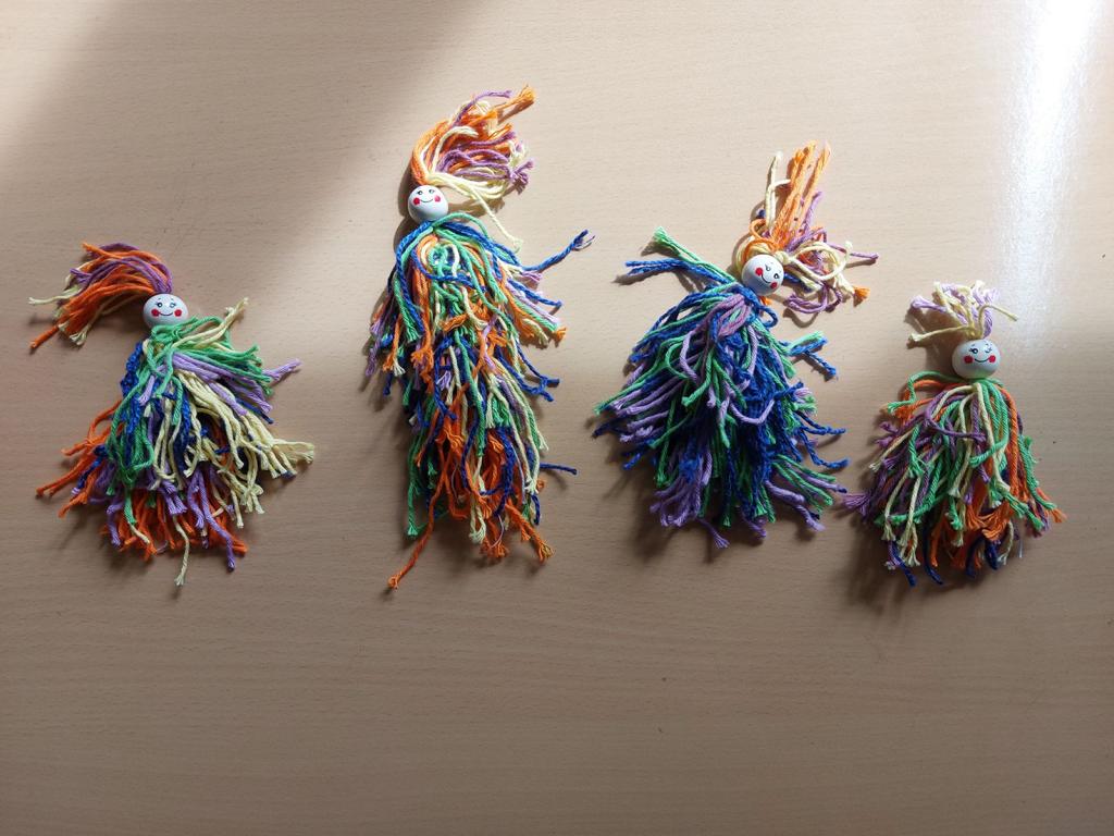 Im Kunstunterricht hat der Jahrgang 3 diese niedlichen Knotenpuppen geknotet. Dafür mussten wir Wolle um eine Spielkarte wickeln, aufschneiden und an ein Baumwollgarn knoten. Dies haben wir mit verschiedenen Farben Wolle immer wieder wiederholt, bis unsere Puppen ein prächtiges Kleid hatten und wir zufrieden waren. Etwas Geduld und Fingerspitzenfertigkeit waren notwendig, aber am Ende hatte jeder eine tolle Puppe geknotet.