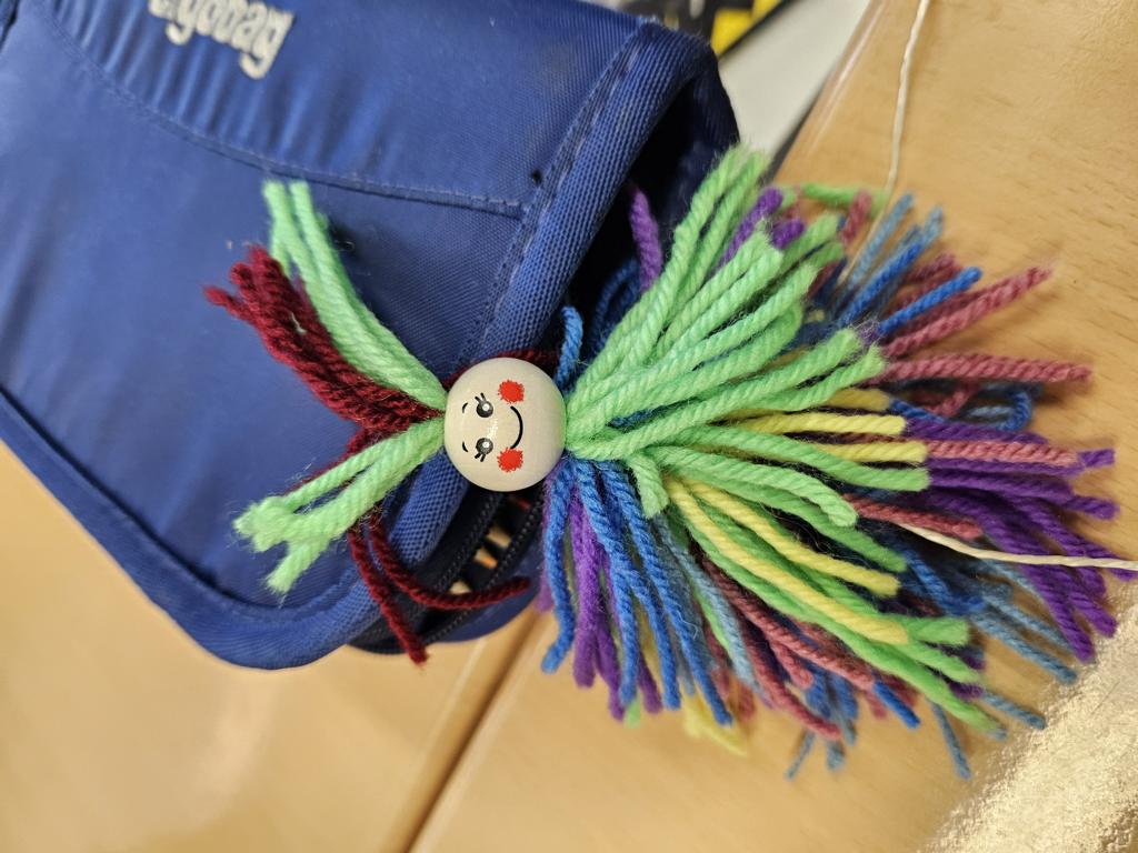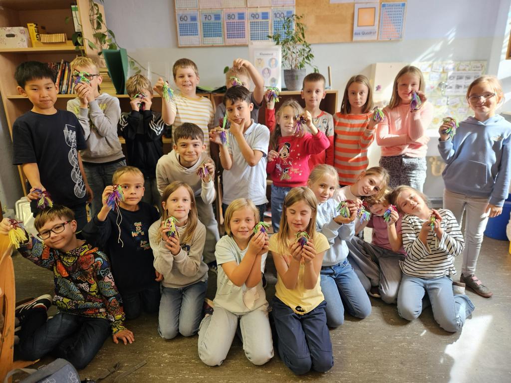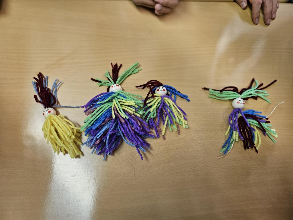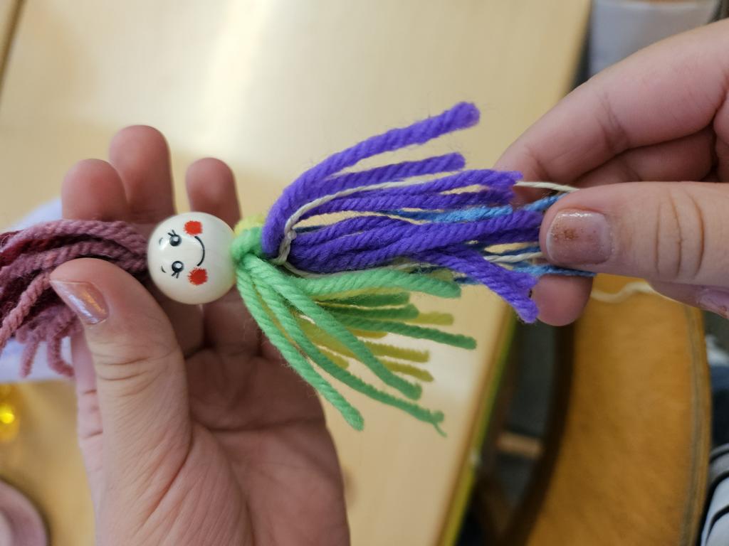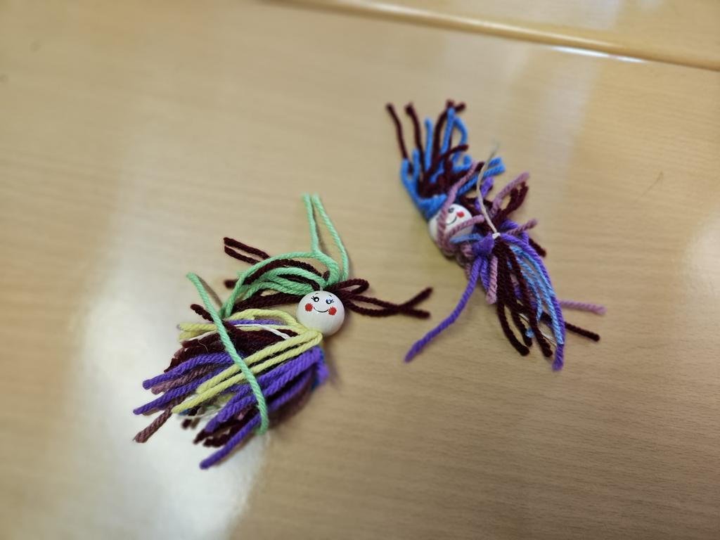 Im Kunstunterricht hat der Jahrgang 3 diese niedlichen Knotenpuppen geknotet. Dafür mussten wir Wolle um eine Spielkarte wickeln, aufschneiden und an ein Baumwollgarn knoten. Dies haben wir mit verschiedenen Farben Wolle immer wieder wiederholt, bis unsere Puppen ein prächtiges Kleid hatten und wir zufrieden waren. Etwas Geduld und Fingerspitzenfertigkeit waren notwendig, aber am Ende hatte jeder eine tolle Puppe geknotet.