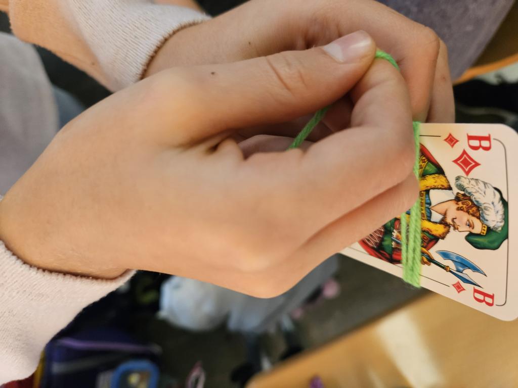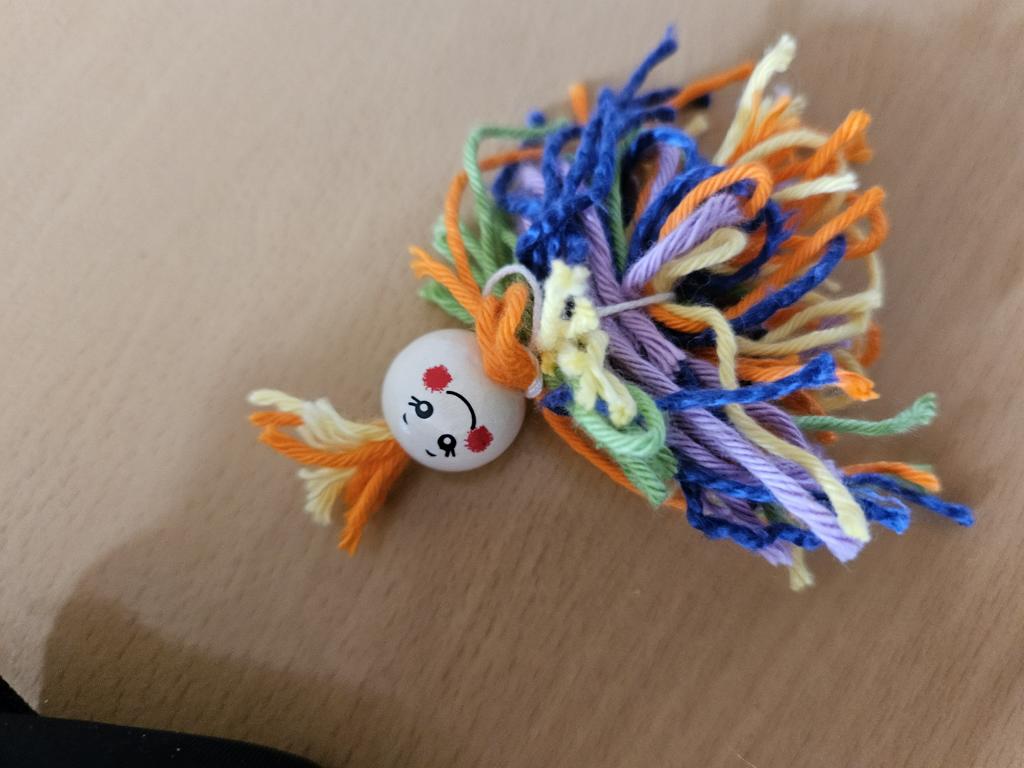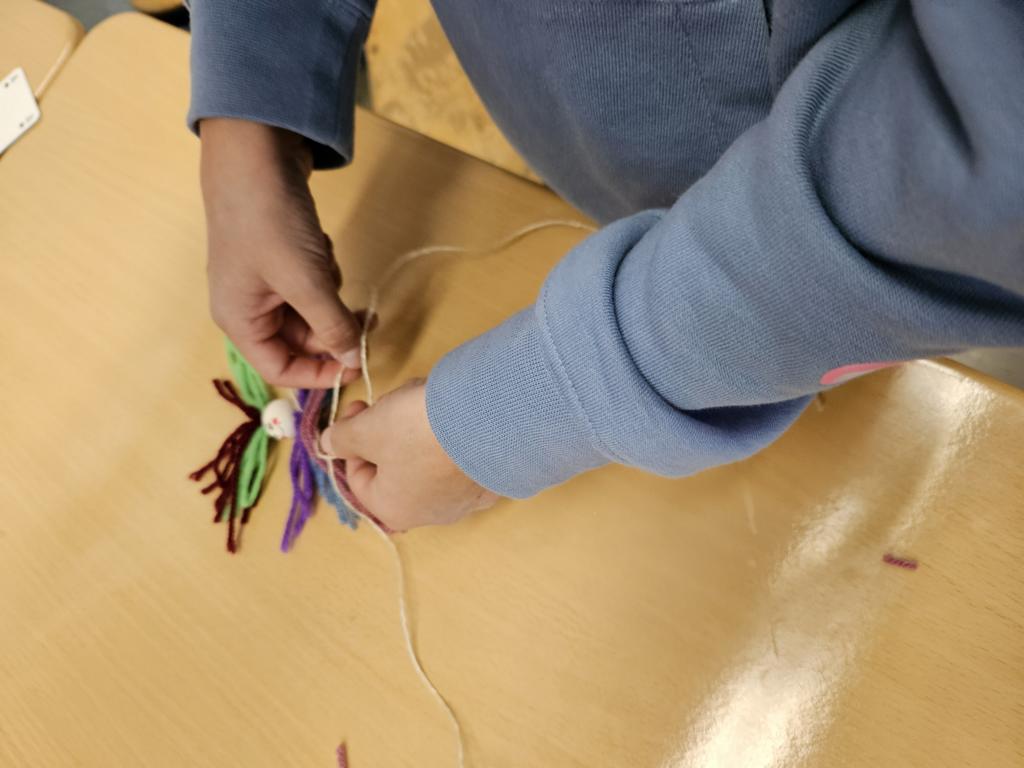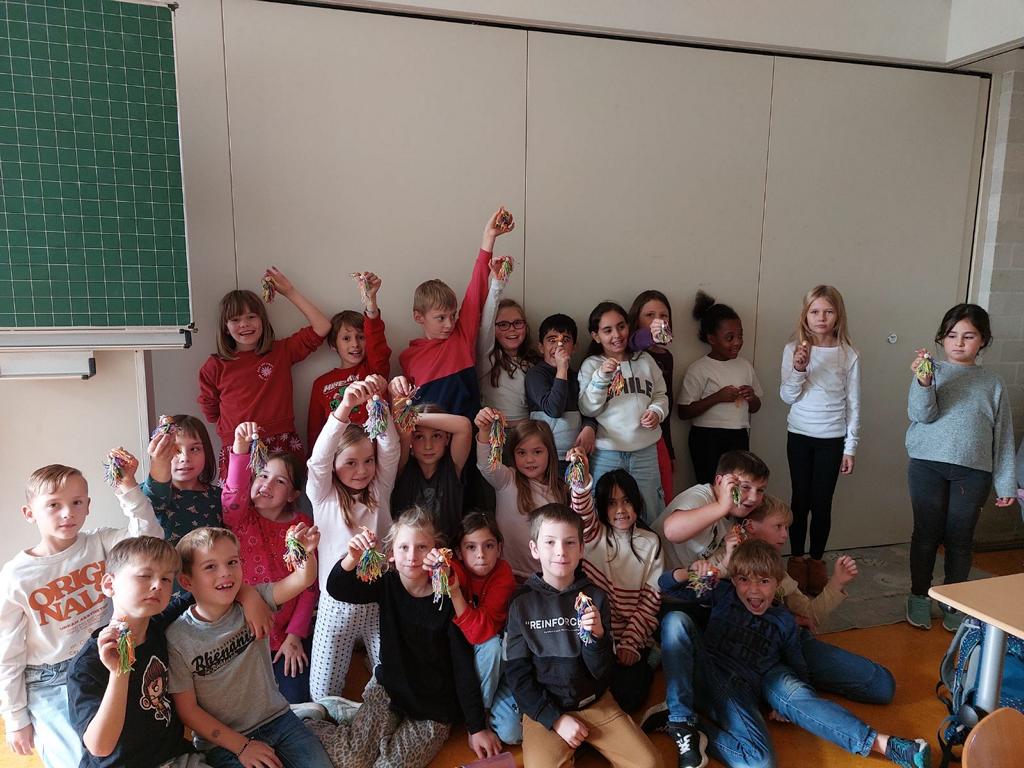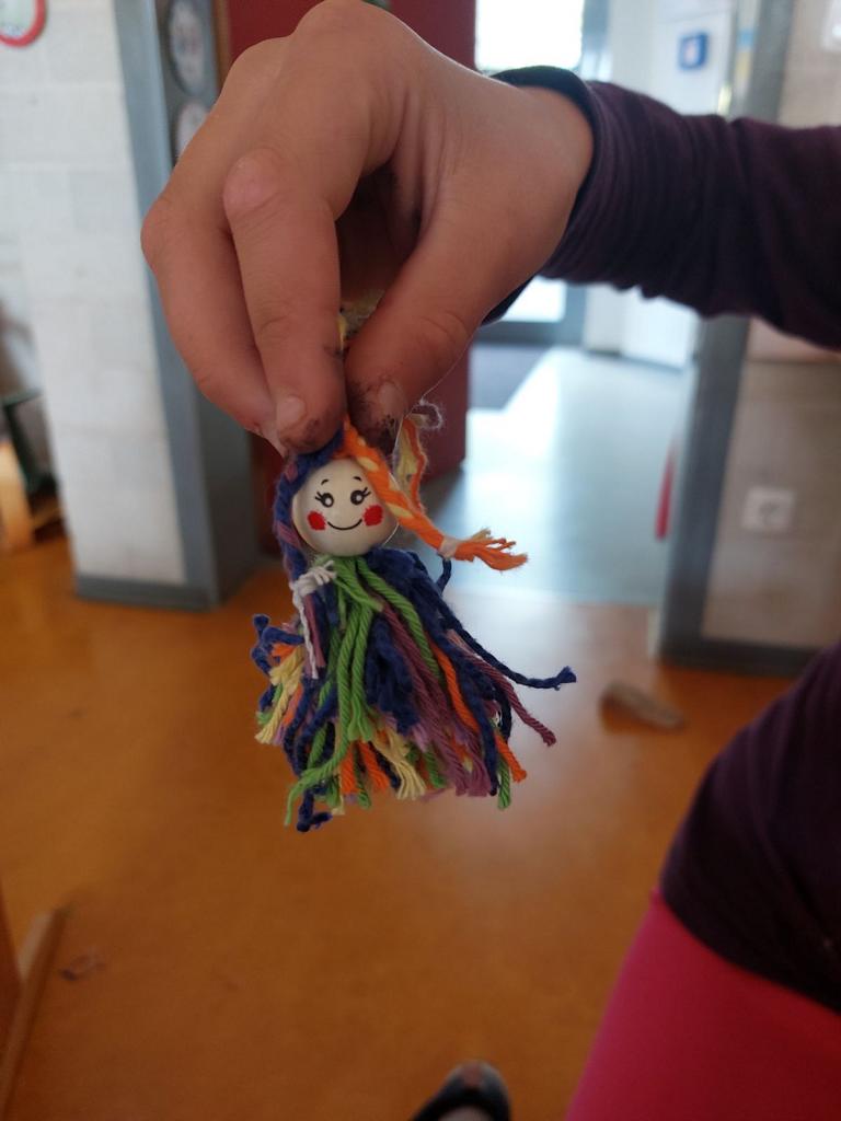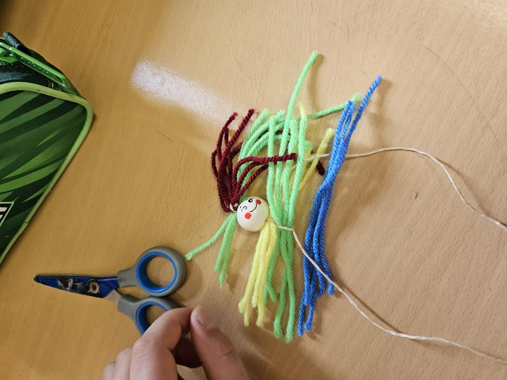 Im Kunstunterricht hat der Jahrgang 3 diese niedlichen Knotenpuppen geknotet. Dafür mussten wir Wolle um eine Spielkarte wickeln, aufschneiden und an ein Baumwollgarn knoten. Dies haben wir mit verschiedenen Farben Wolle immer wieder wiederholt, bis unsere Puppen ein prächtiges Kleid hatten und wir zufrieden waren. Etwas Geduld und Fingerspitzenfertigkeit waren notwendig, aber am Ende hatte jeder eine tolle Puppe geknotet.