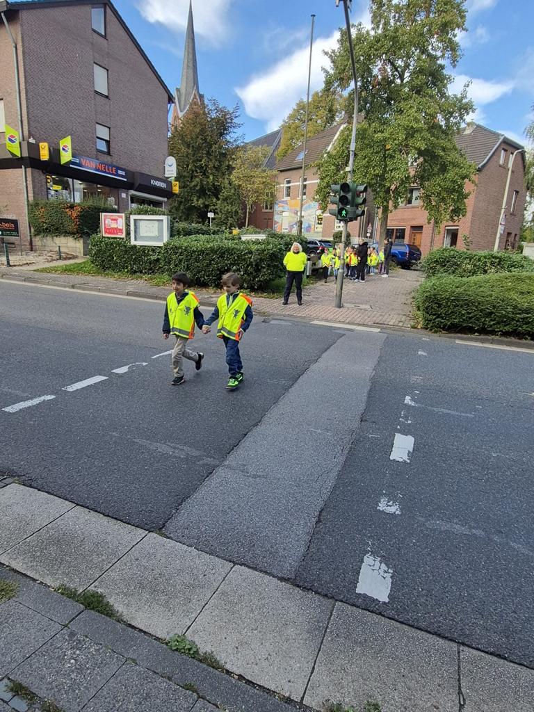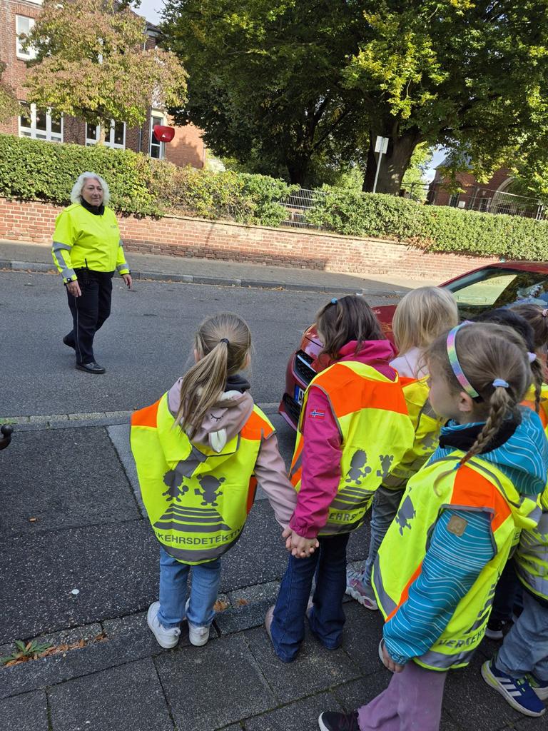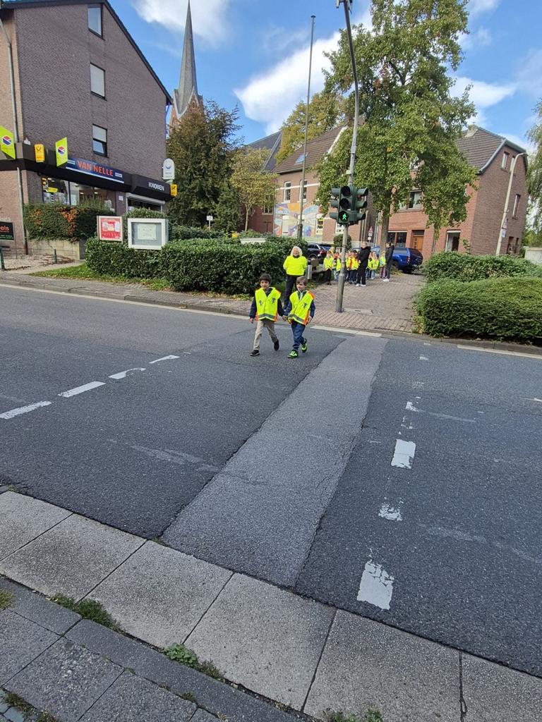 Nach einigen Erklärungen in der Klasse, haben wir im Straßenverkehr verschiedene Stationen geübt. Aber bevor wir den Schulhof verließen, haben wir noch tolle Warnwesten geschenkt bekommen, sodass wir morgens nun gut zu sehen sind.  Zuerst ging es über den Zebrastreifen vor unserer Schule, das mussten alle Kinder ganz alleine bewältigen.