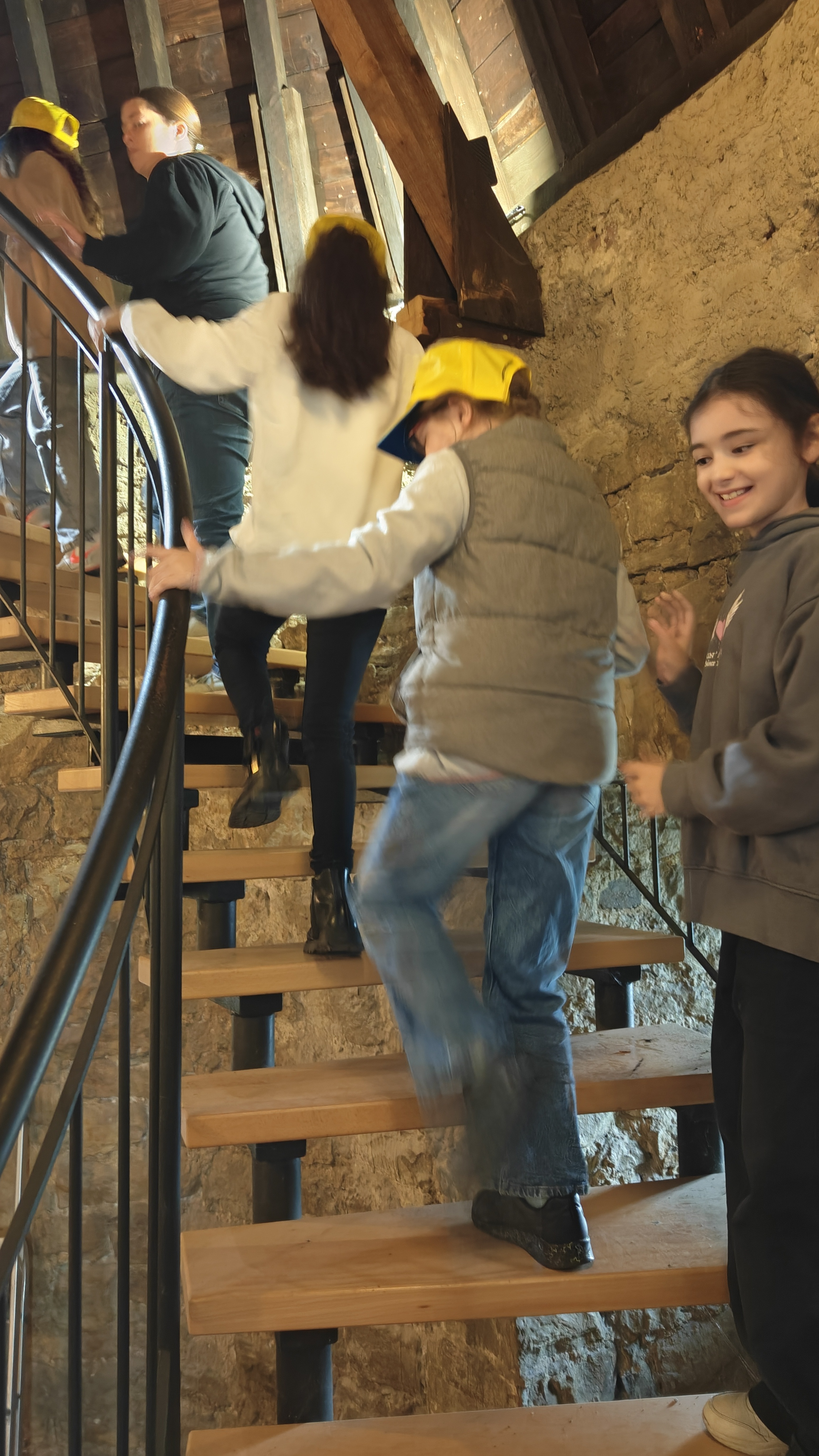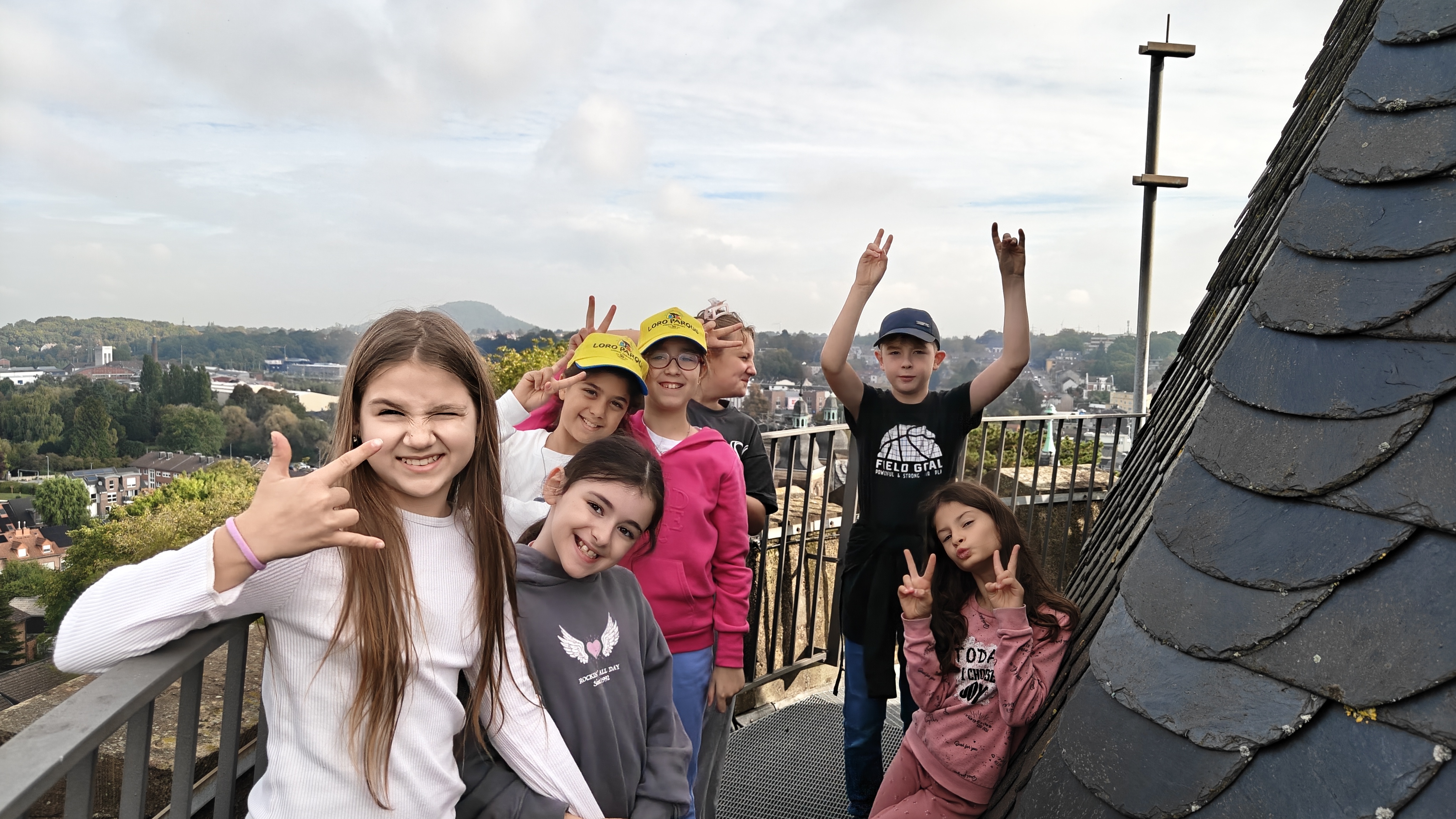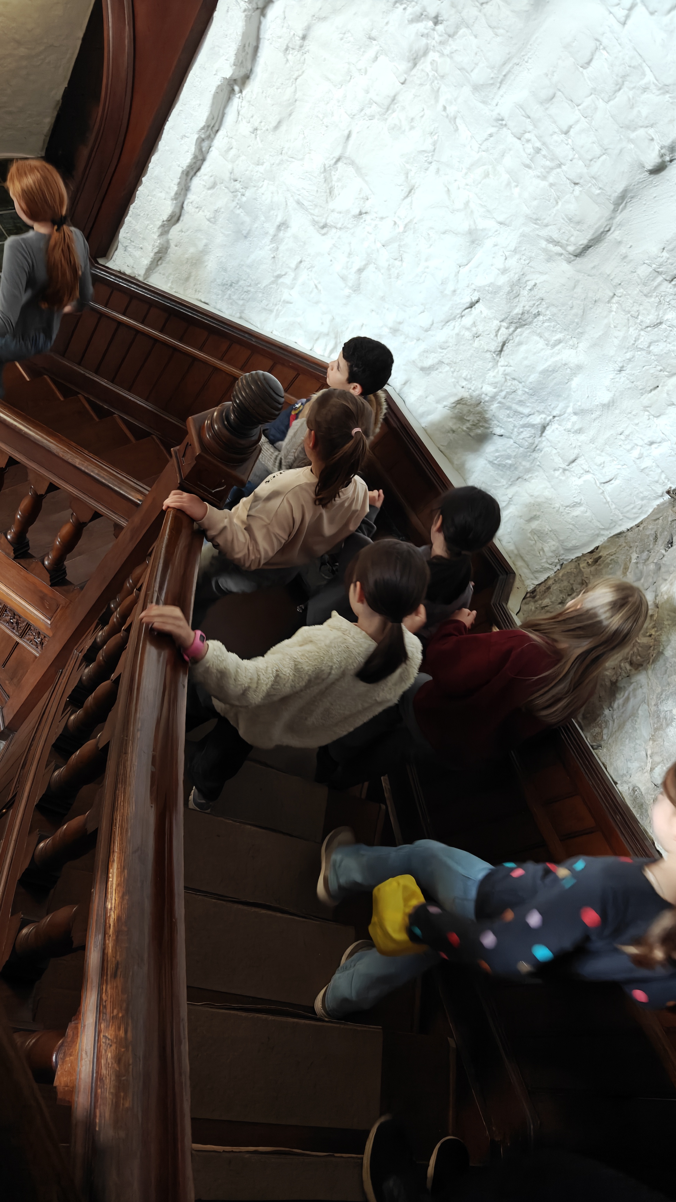 An der Burg wurden wir herzlich vom Vorstand des Burgvereins Rode empfangen. Danach führte uns Dr. Weyer etwa neunzig Minuten durch die Anlage. Er erklärte uns, wofür die Burg in früheren Zeiten genutzt wurde, zeigte uns den ältesten Teil und auch die neueren Gebäude. Besonders spannend war der Turm, den wir von unten bis zur Spitze erkunden durften. Dort, wo früher der Richter seine Verhandlungen abhielt, erfuhren wir, dass anstelle des heutigen Tisches einst ein Loch war, das direkt in den Kerker führte. Der Turm hatte damals gar keine Türen, man gelangte nur über Leitern durch die Schießscharten hinein. Ganz oben auf der Turmspitze erwartete uns ein wunderbarer Blick über die Stadt Herzogenrath.