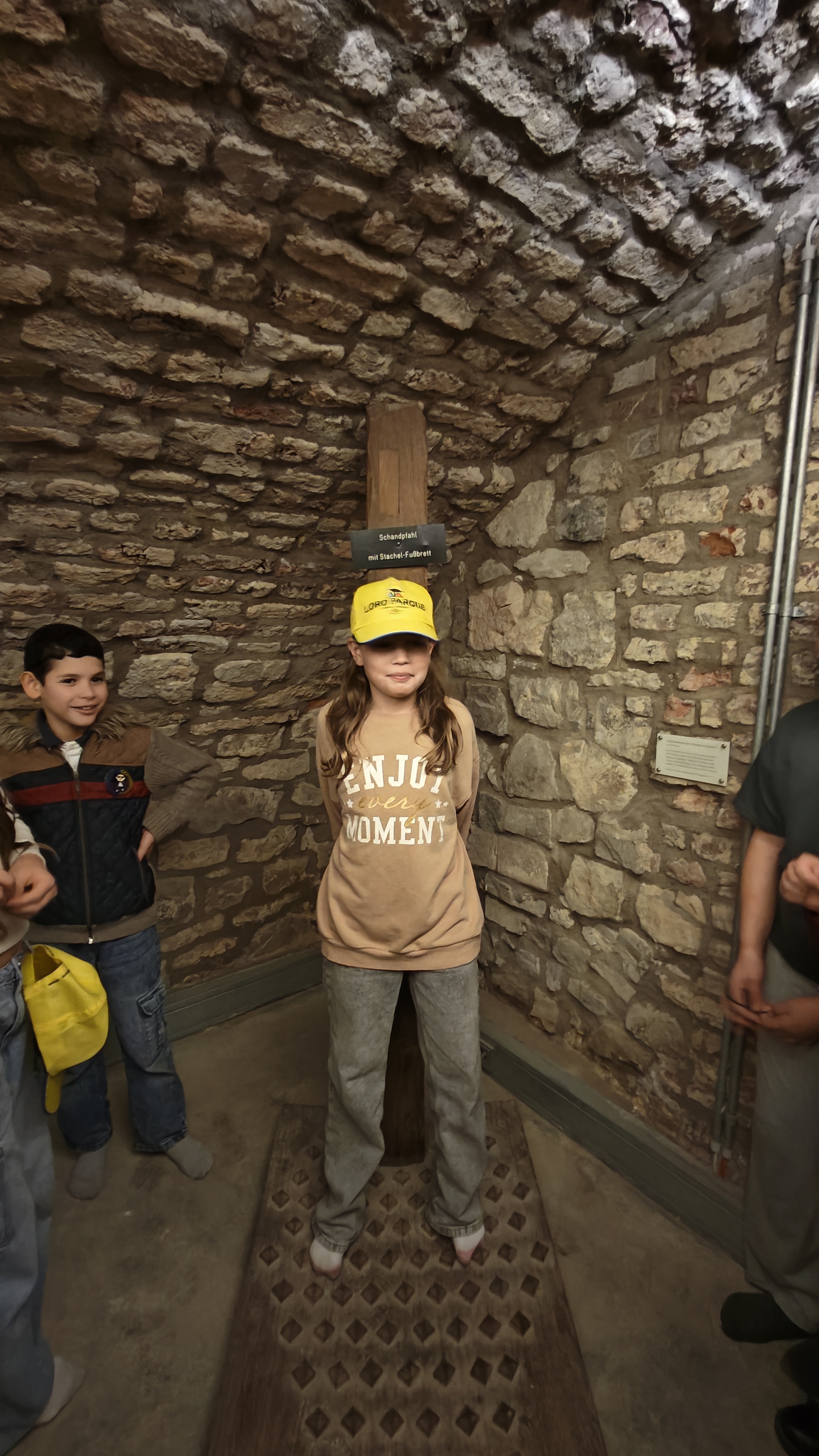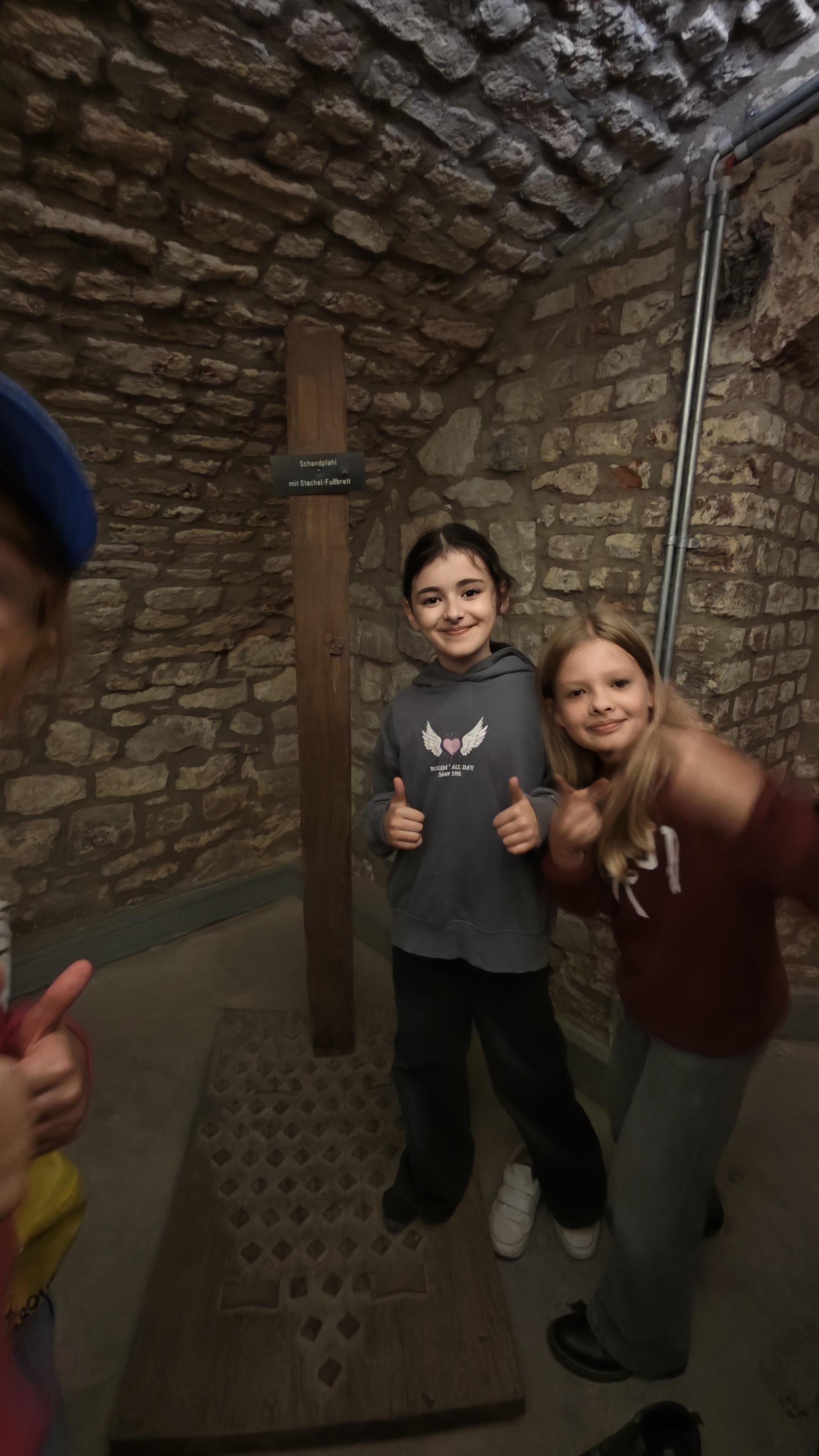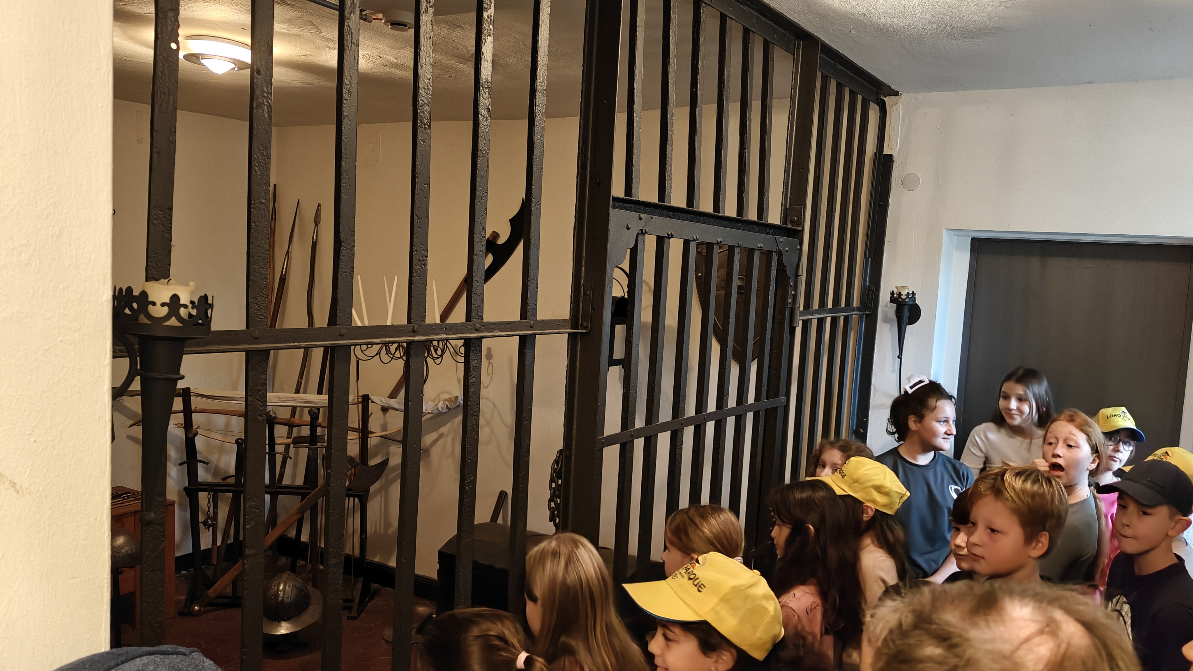 Die Kinder durften ein nachgebildetes stumpfes Schwert in die Hand nehmen und stellten überrascht fest, wie schwer es war. Auch eine Armbrust konnten wir hochheben und die dazugehörigen Bolzen betrachten. Sie war so schwer, dass oft zwei Kinder gleichzeitig tragen mussten. Im Keller fanden wir viele Ausrüstungsgegenstände und Rüstungsteile aus dem Mittelalter. Wir betraten den Folterkeller, betrachteten den spanischen Reiter und stellten uns sogar auf den Schandpfahl, wofür wir die Schuhe auszogen. Lange hielt das keiner aus. Schließlich konnten wir noch das Gefängnis besuchen, das heute durch eine Tür zugänglich ist, und erfuhren dabei einiges über die Bockreiterprozesse.
