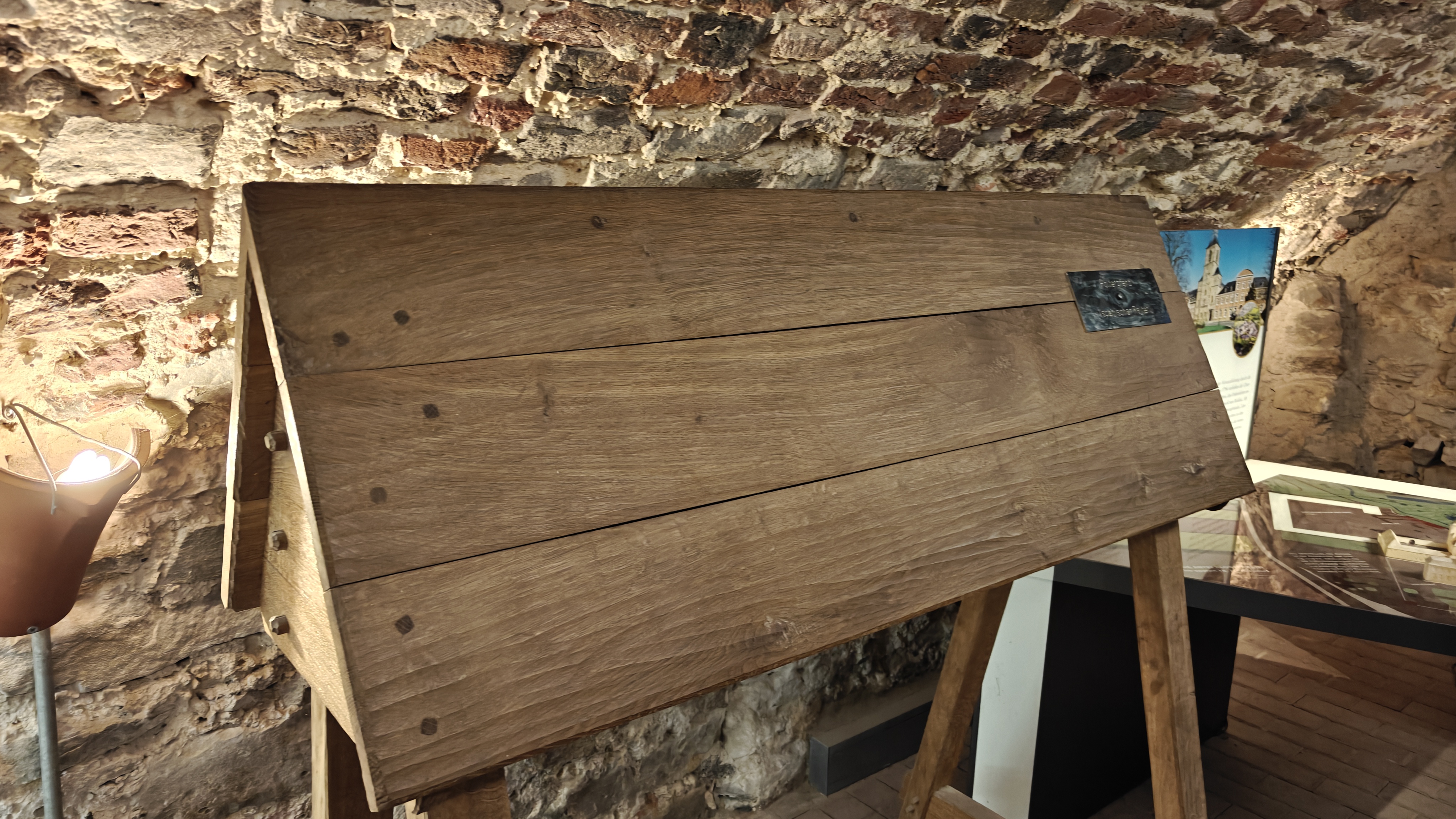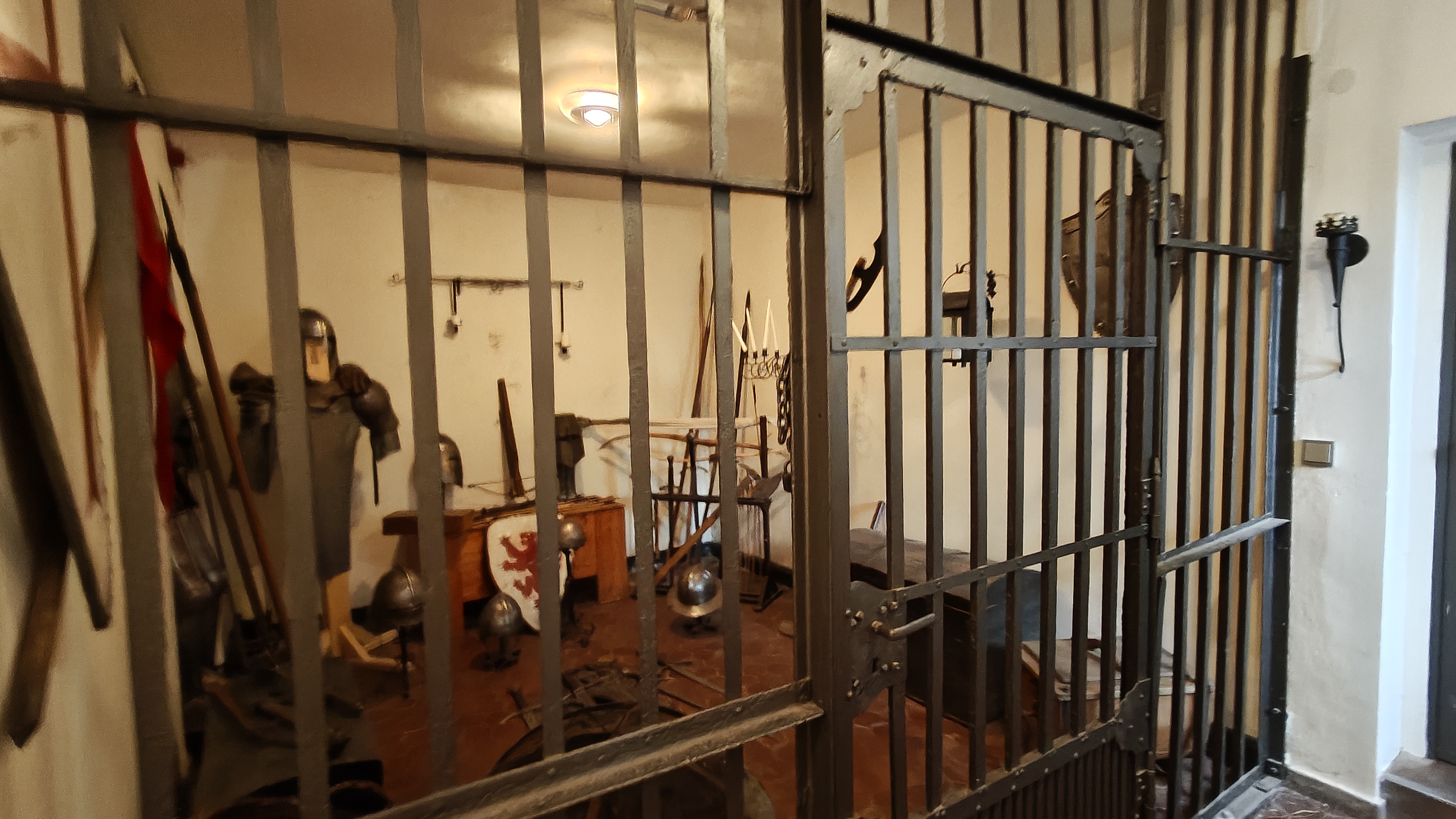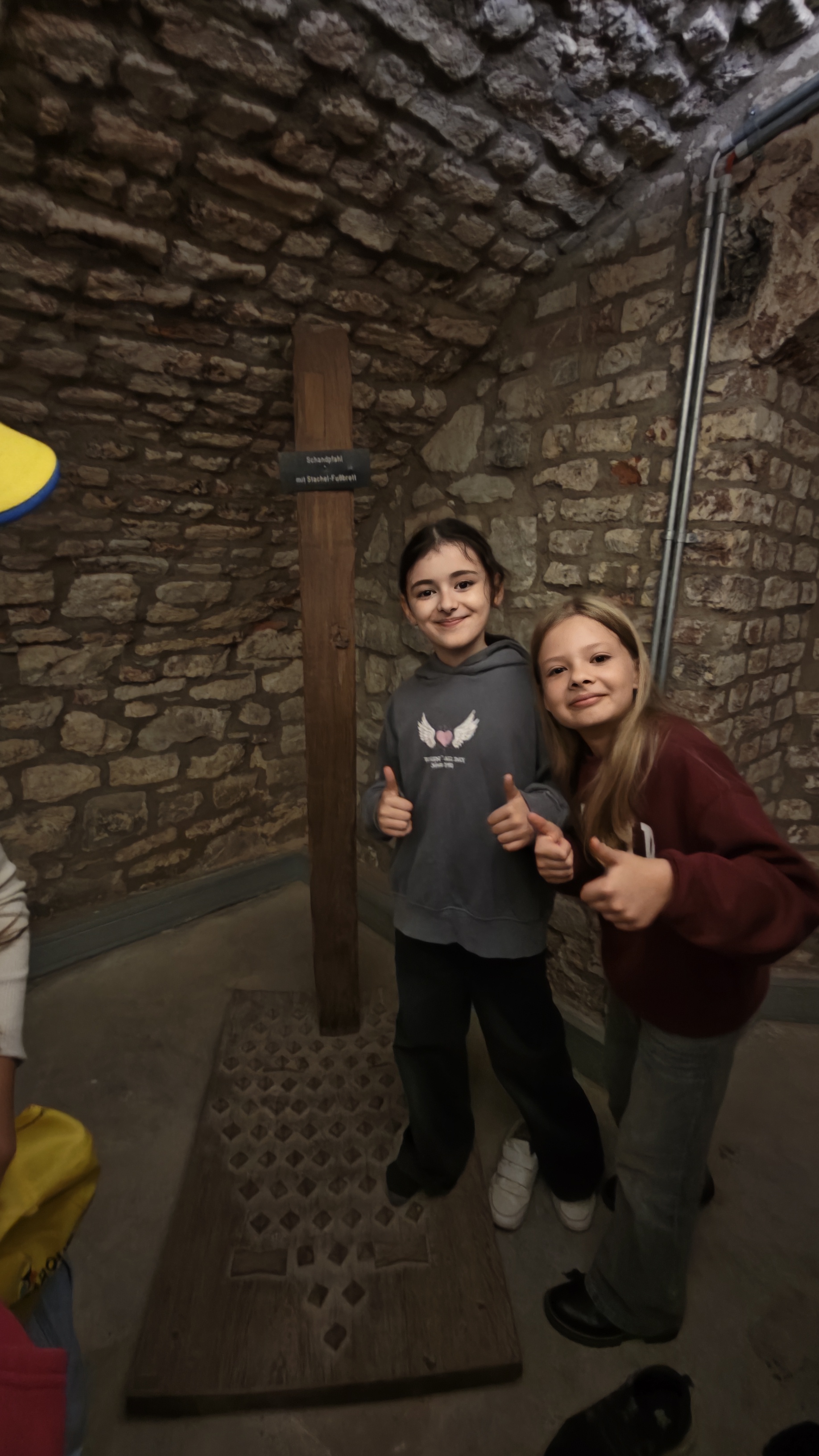 Die Kinder durften ein nachgebildetes stumpfes Schwert in die Hand nehmen und stellten überrascht fest, wie schwer es war. Auch eine Armbrust konnten wir hochheben und die dazugehörigen Bolzen betrachten. Sie war so schwer, dass oft zwei Kinder gleichzeitig tragen mussten. Im Keller fanden wir viele Ausrüstungsgegenstände und Rüstungsteile aus dem Mittelalter. Wir betraten den Folterkeller, betrachteten den spanischen Reiter und stellten uns sogar auf den Schandpfahl, wofür wir die Schuhe auszogen. Lange hielt das keiner aus. Schließlich konnten wir noch das Gefängnis besuchen, das heute durch eine Tür zugänglich ist, und erfuhren dabei einiges über die Bockreiterprozesse.