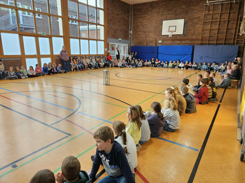 Als musikalische Grundschule integrieren wir viel Musik in unseren Tag. Heute fand wieder unser Herbstsingen statt, bei dem wir uns mit der ganzen Schule in der Turnhalle getroffen und gemeinsam gesungen haben. Zunächst entzündete Frau Grabowski-Kämper jedoch ein Licht und wir hielten einen Moment inne, in dem jeder an jemanden denken oder einen guten Wunsch gedanklich senden konnte.