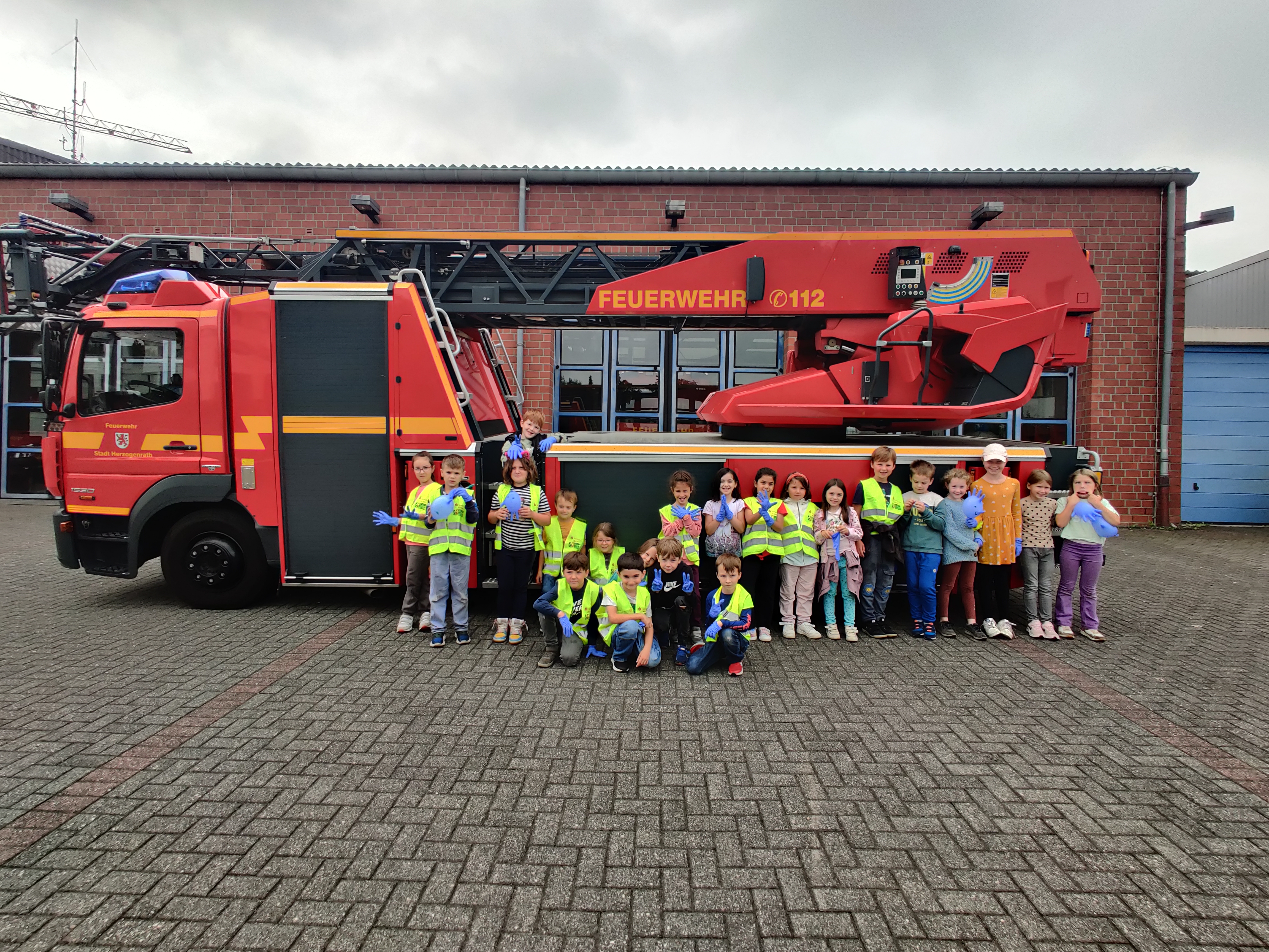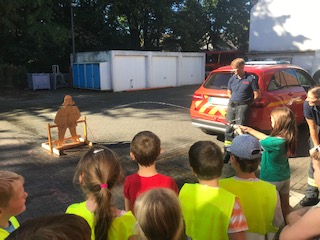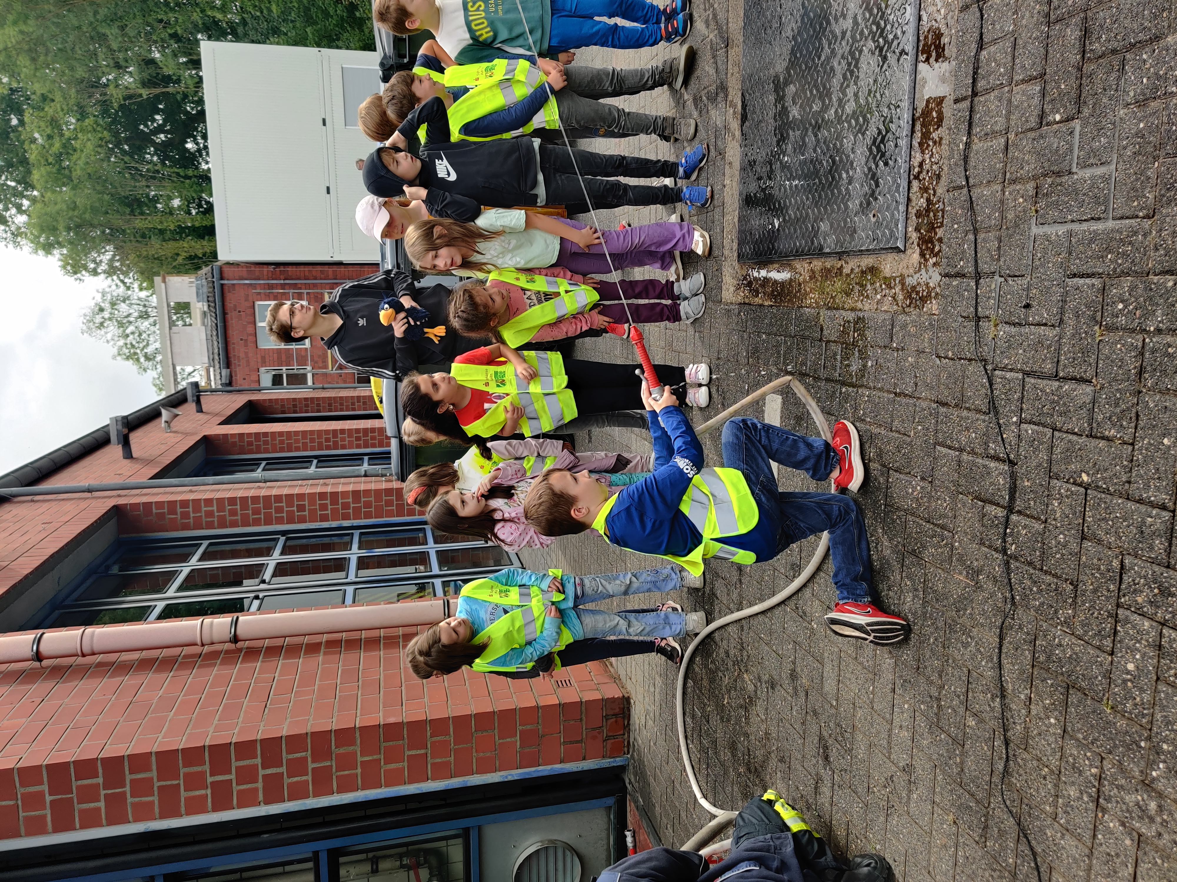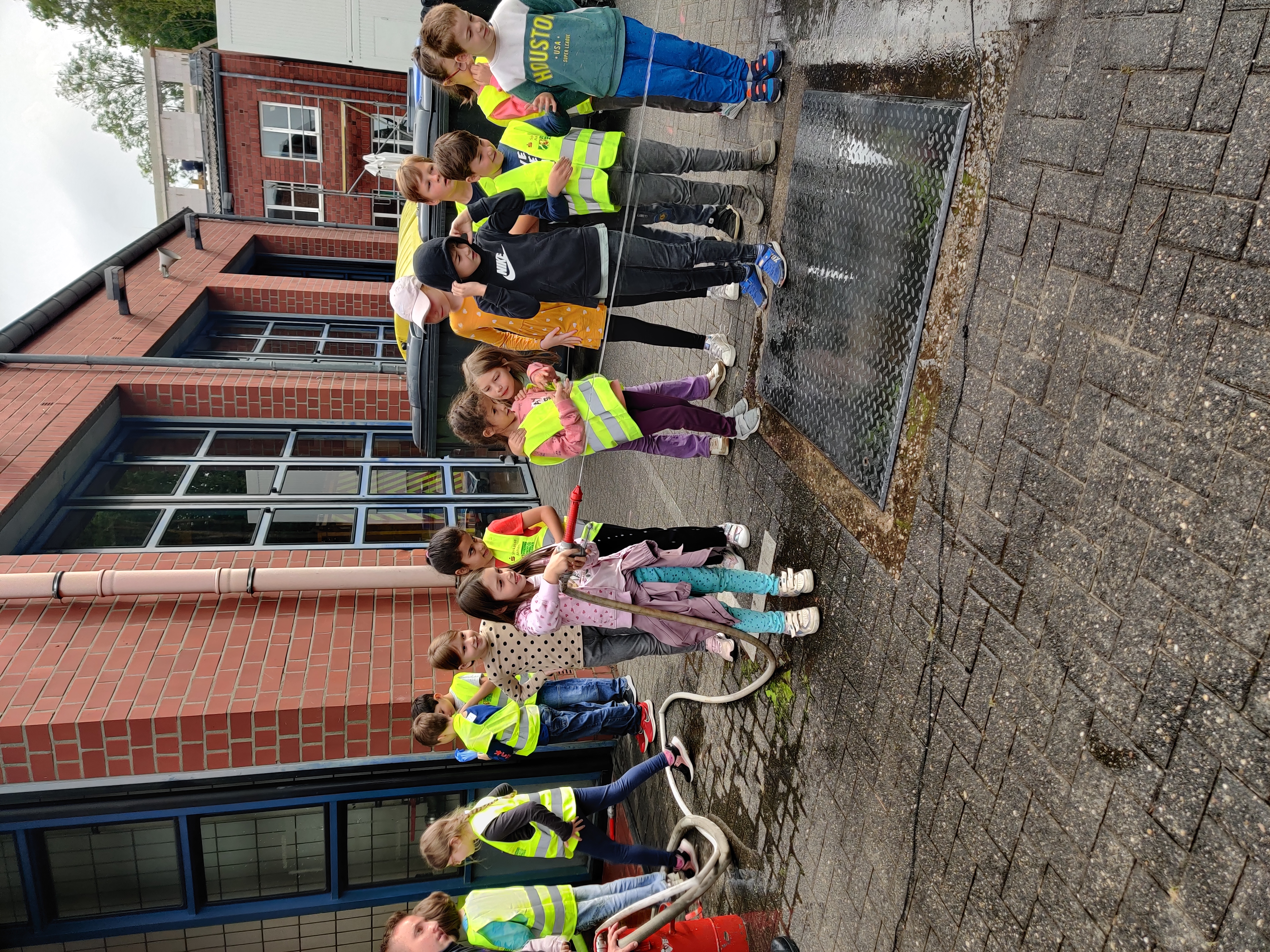 Außerdem sind beide Klassen zur Feuerwache in Herzogenrath gewandert. Auch dort wurden wir von echten Feuerwehrmenschen begrüßt und haben viel gelernt. Wir sind durch die ganze Wache geführt worden und haben sogar die Küche und die Ruheräume der Feuerwehrleute gesehen, die immer 24 Stunden Dienst haben.. Besonders toll war aber, dass jeder, der wollte, eine echte Feuerwehrjacke und eine Helm anziehen durfte! Wie echte Feuerwehrleute durften die Kinder mit einem Schlauch Wasser spritzen. Hier mussten sie in Teams arbeiten, ein Kind pumpt das Wasser, das andere zielt und hält den Schlauch. Immer wieder hieß es“ Wasser marsch“ und später „ Wasser stopp!“. Es war toll!