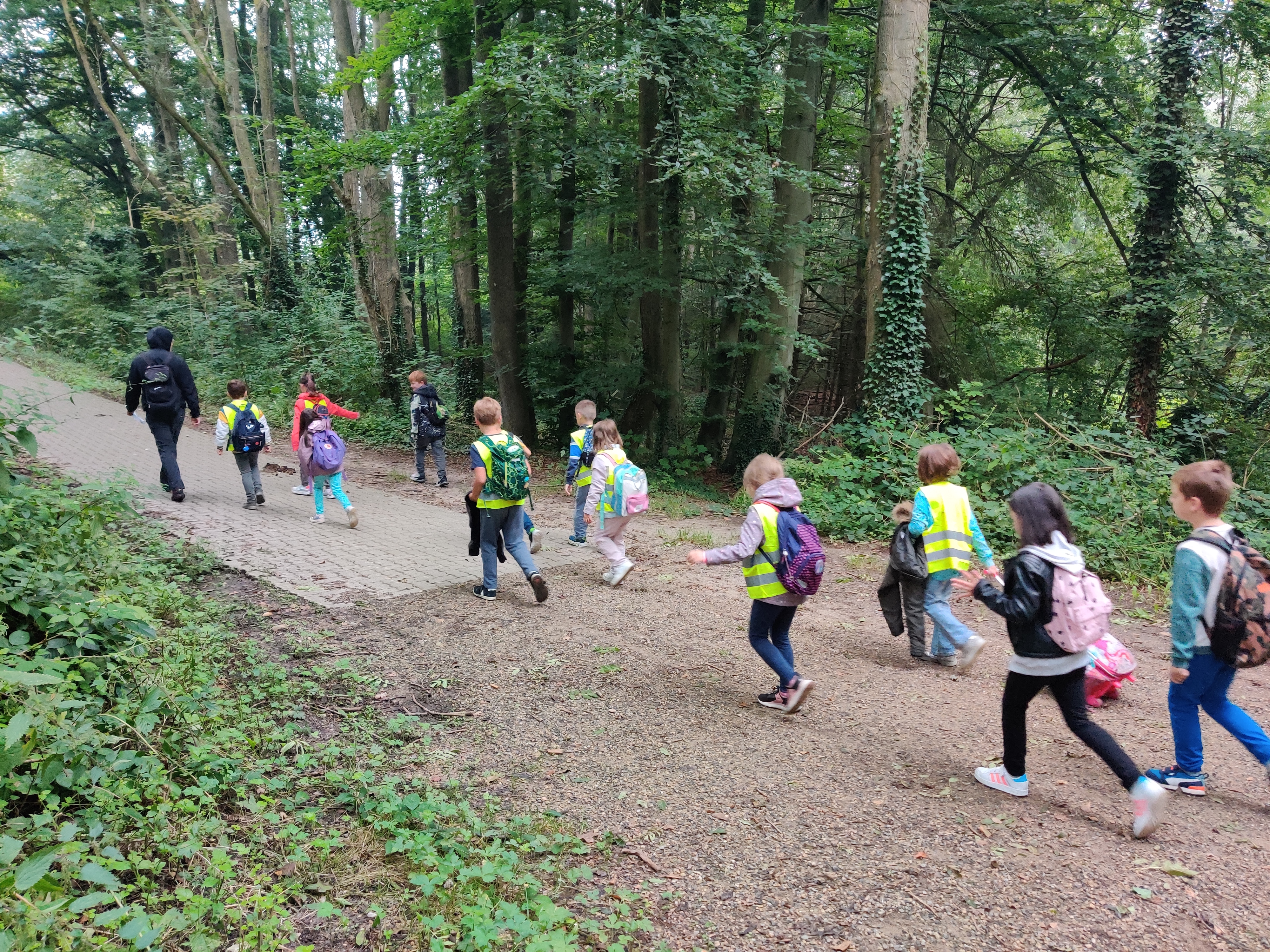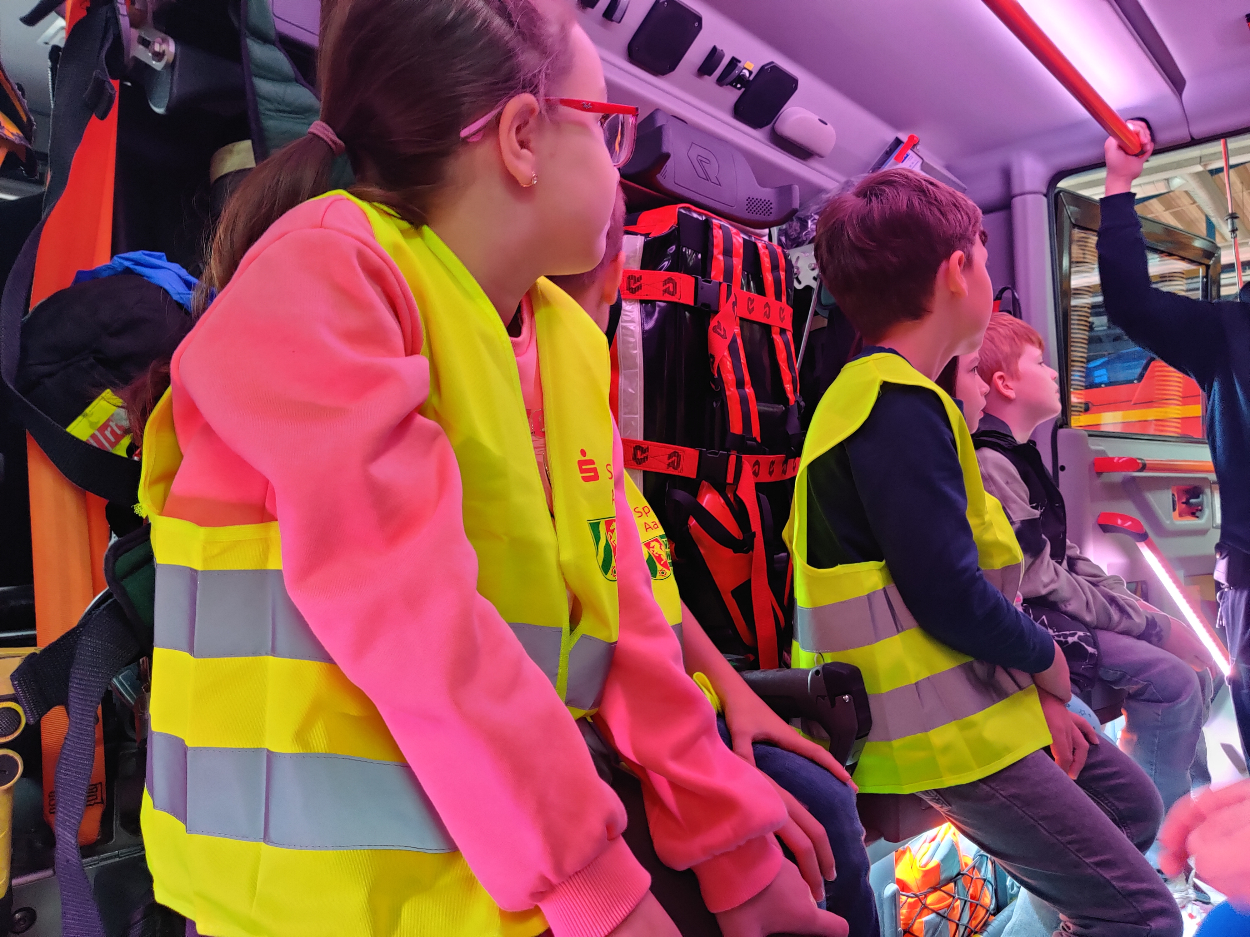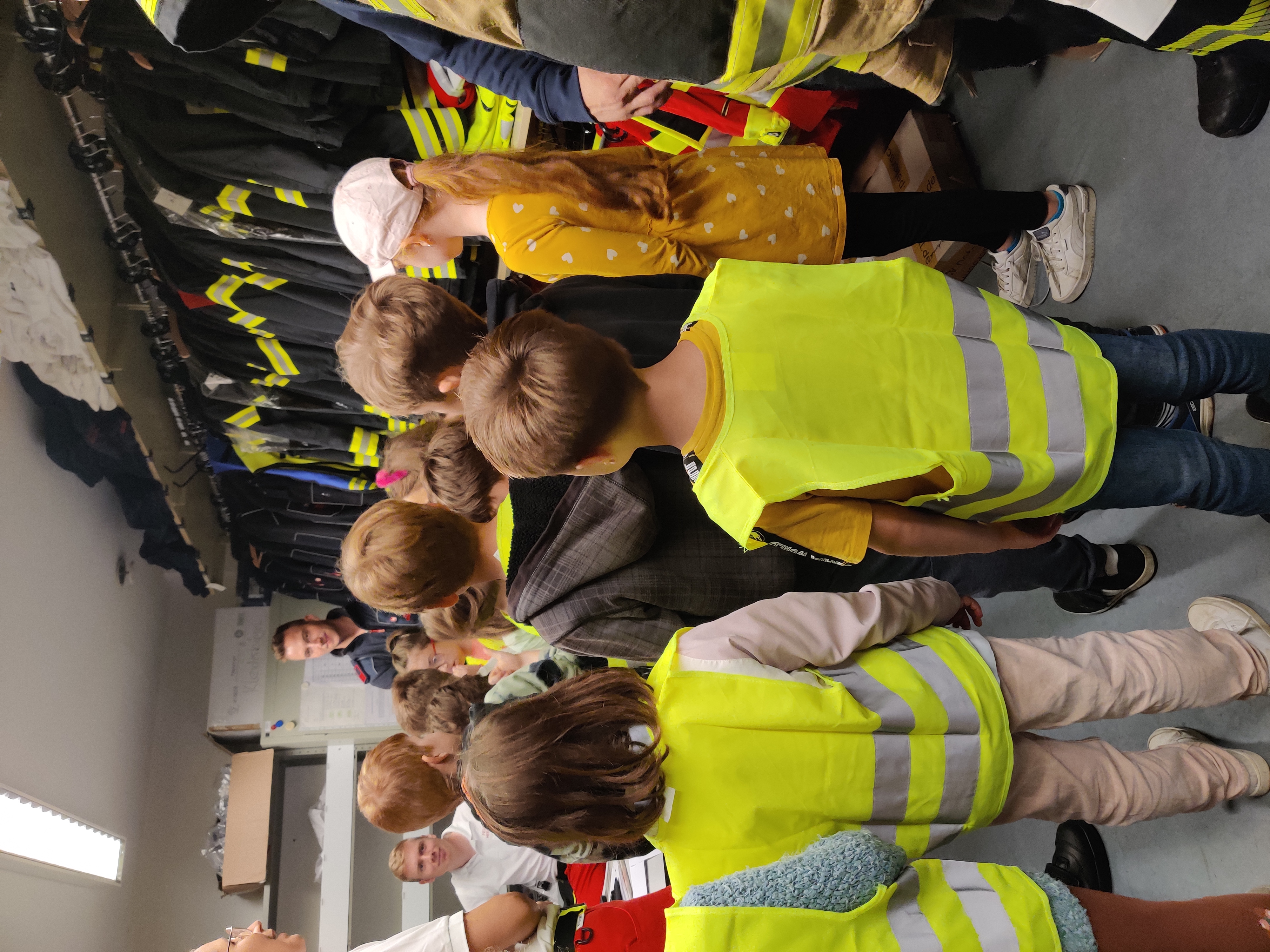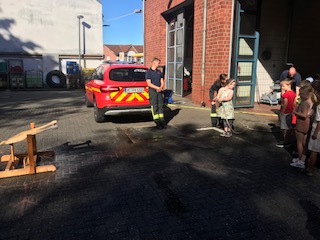 Außerdem sind beide Klassen zur Feuerwache in Herzogenrath gewandert. Auch dort wurden wir von echten Feuerwehrmenschen begrüßt und haben viel gelernt. Wir sind durch die ganze Wache geführt worden und haben sogar die Küche und die Ruheräume der Feuerwehrleute gesehen, die immer 24 Stunden Dienst haben.. Besonders toll war aber, dass jeder, der wollte, eine echte Feuerwehrjacke und eine Helm anziehen durfte! Wie echte Feuerwehrleute durften die Kinder mit einem Schlauch Wasser spritzen. Hier mussten sie in Teams arbeiten, ein Kind pumpt das Wasser, das andere zielt und hält den Schlauch. Immer wieder hieß es“ Wasser marsch“ und später „ Wasser stopp!“. Es war toll!
